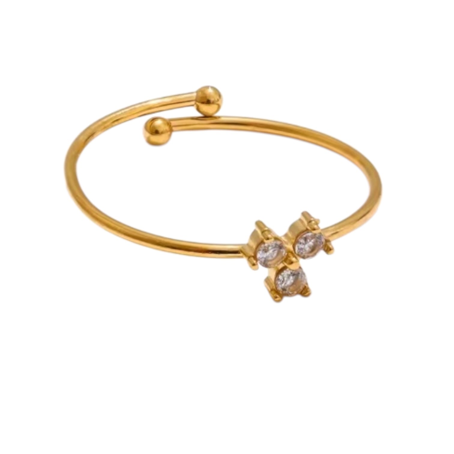 L'Anello Trifoglio è realizzato in acciaio inox placcato oro 18K, garantendo durata e brillantezza nel tempo. Tre zirconi bianchi, disposti a formare un elegante trifoglio, donano un tocco di raffinatezza e simbolismo al gioiello. Perfetto per chi cerca un accessorio sofisticato che unisca design classico e resistenza dei materiali.