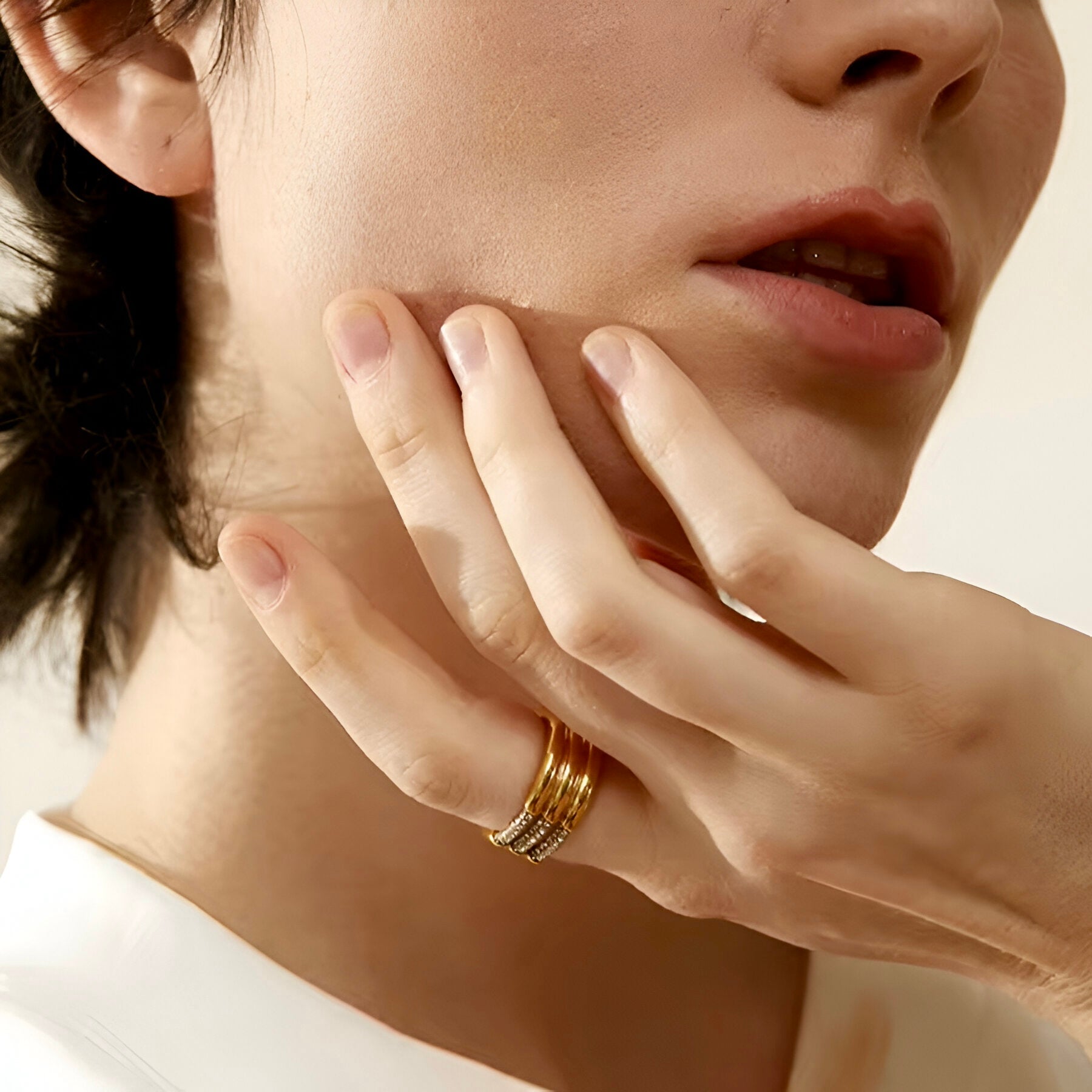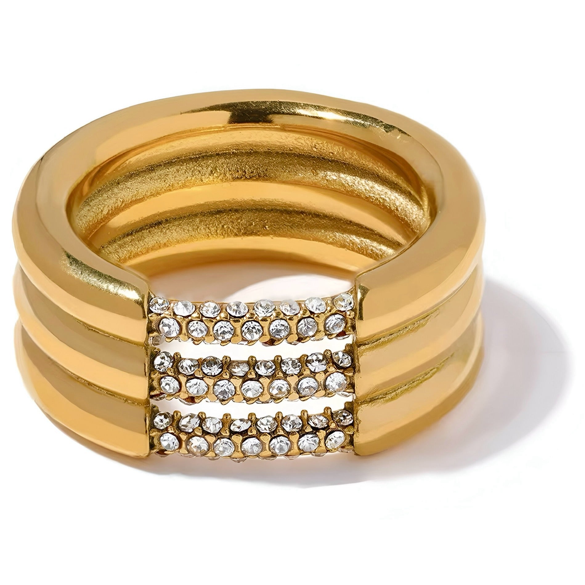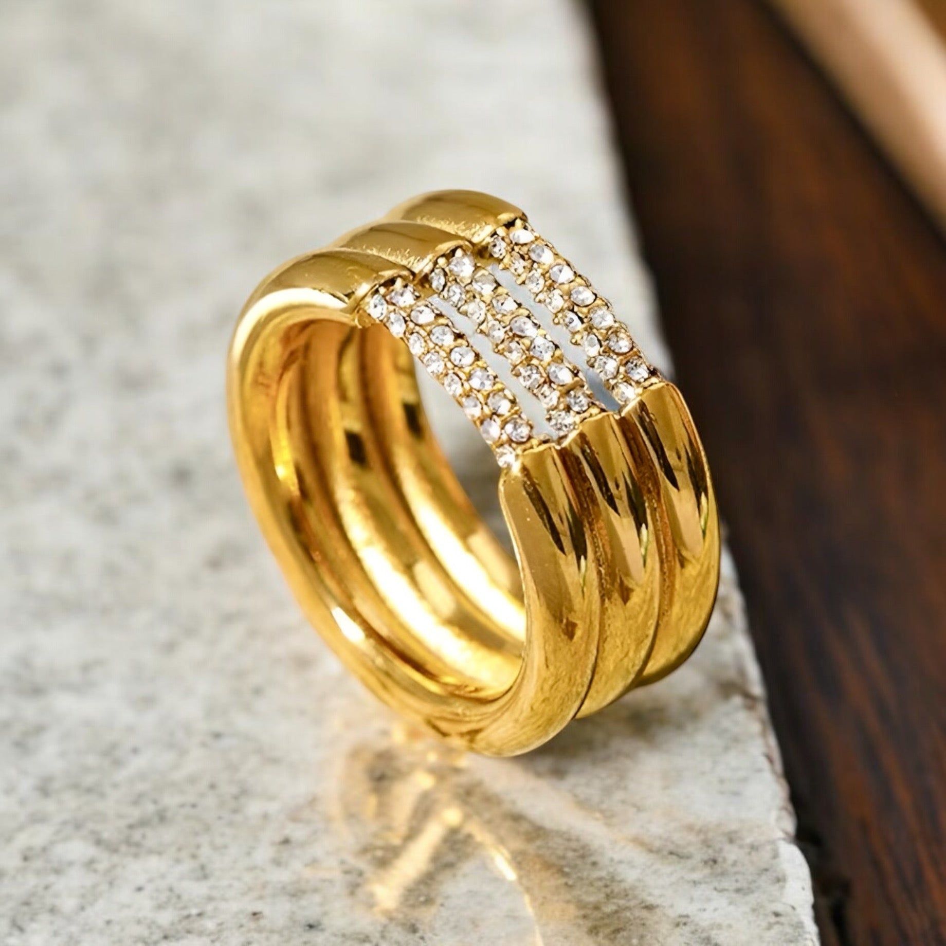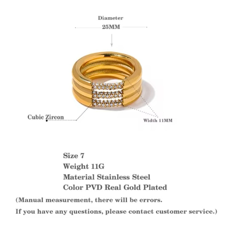 Scopri l'eleganza moderna dell'anello "Trilogy Shine Bottom". Realizzato in acciaio inossidabile con una raffinata placcatura PVD in oro 18 carati, questo anello cattura l'essenza del lusso contemporaneo. I suoi tre fasci distintivi sono impreziositi da scintillanti zirconi, che aggiungono una brillantezza sofisticata e intramontabile. Perfetto per chi desidera un accessorio che unisca stile e raffinatezza, rendendo ogni occasione speciale.