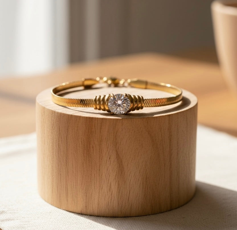 Bracciale in acciaio inox placcato oro 28K o argento 925 sterling, caratterizzato da un elegante motivo cobra con zircone ovale bianco. La lavorazione raffinata combina materiali nobili e preziosi dettagli gemologici, garantendo durabilità e brillantezza nel tempo. Disponibile in due finiture distinte per adattarsi a ogni preferenza estetica. Un accessorio sofisticato che unisce design contemporaneo e qualità artigianale.