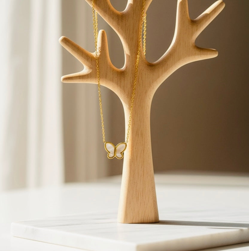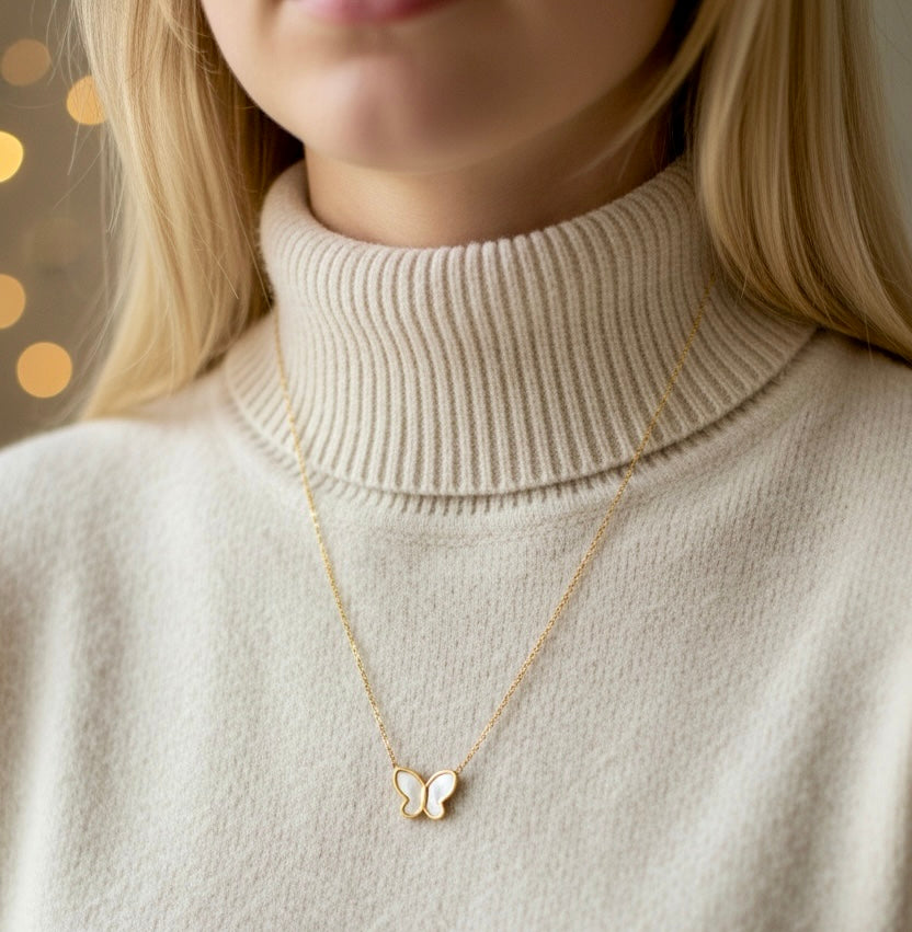 La collana Butterfly è un inno alla leggerezza e alla rinascita. Realizzata in acciaio inossidabile placcato oro 18k, unisce resistenza e raffinatezza in un design delicato ma luminoso. La farfalla, simbolo di libertà e trasformazione, dona un tocco poetico a ogni look, rendendola perfetta da indossare ogni giorno o nelle occasioni speciali.