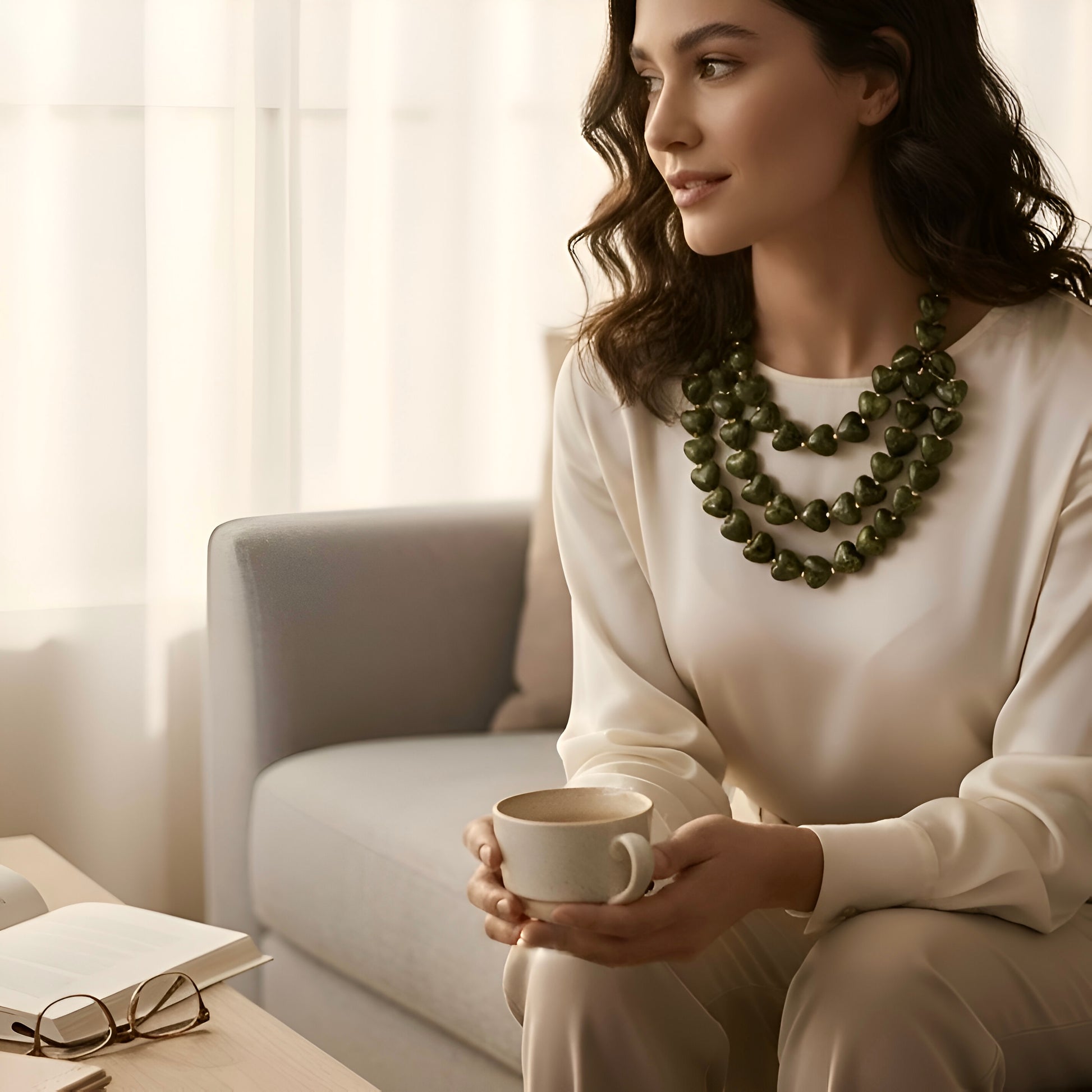 La collana Foliage unisce eleganza e originalità con i suoi dettagli in acciaio inox placcato oro 18K e una cascata di piccoli cuoricini in resina epoxy. Disponibile in tre sofisticate varianti di colore — verde, ambra e granata — questo gioiello esalta la bellezza naturale con un tocco contemporaneo, perfetto per chi cerca stile e qualità in ogni dettaglio.