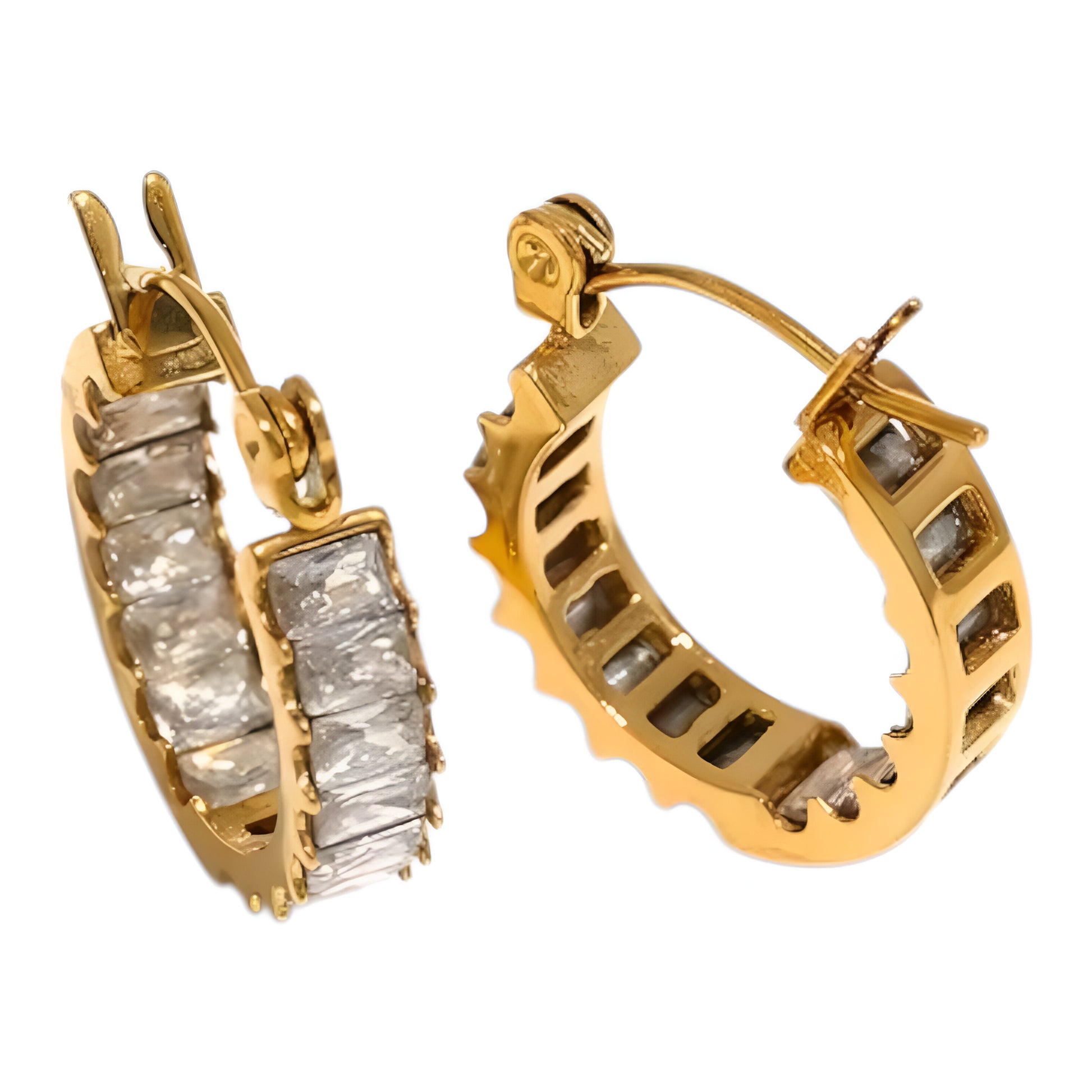 Gli orecchini Guenda Loop Full combinano eleganza e resistenza grazie alla loro struttura in acciaio inox placcato oro 18k o argento 925. Ogni anellino è impreziosito da zirconi rettangolari multicolore, che donano un tocco raffinato e versatile, perfetto per valorizzare ogni look con un dettaglio luminoso e sofisticato.