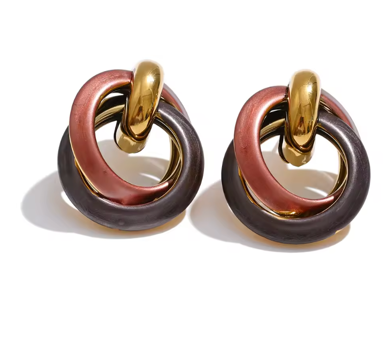 Realizzati in acciaio inox placcato oro 18K, questi orecchini Industrial si distinguono per il design intrecciato che combina eleganza e modernità. Le parti laccate in nero e rame aggiungono un contrasto sofisticato, valorizzando ogni dettaglio. Perfetti per chi cerca un accessorio resistente che unisce stile contemporaneo e qualità professionale.