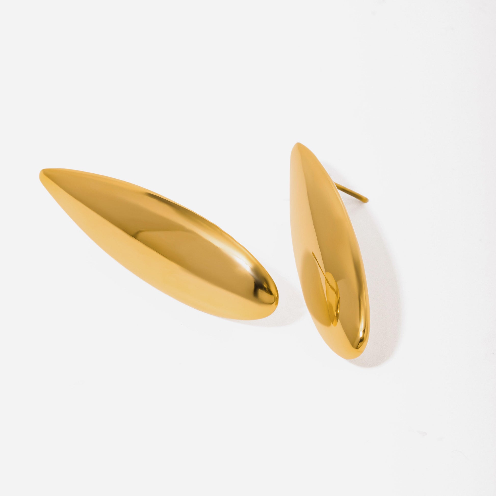 Orecchini Niside dal design essenziale e contemporaneo: una forma allungata e affusolata, lucida come uno specchio, che cattura la luce con eleganza. Realizzati in acciaio inossidabile placcato in oro 18k, sono ipoallergenici e perfetti da indossare ogni giorno con stile.