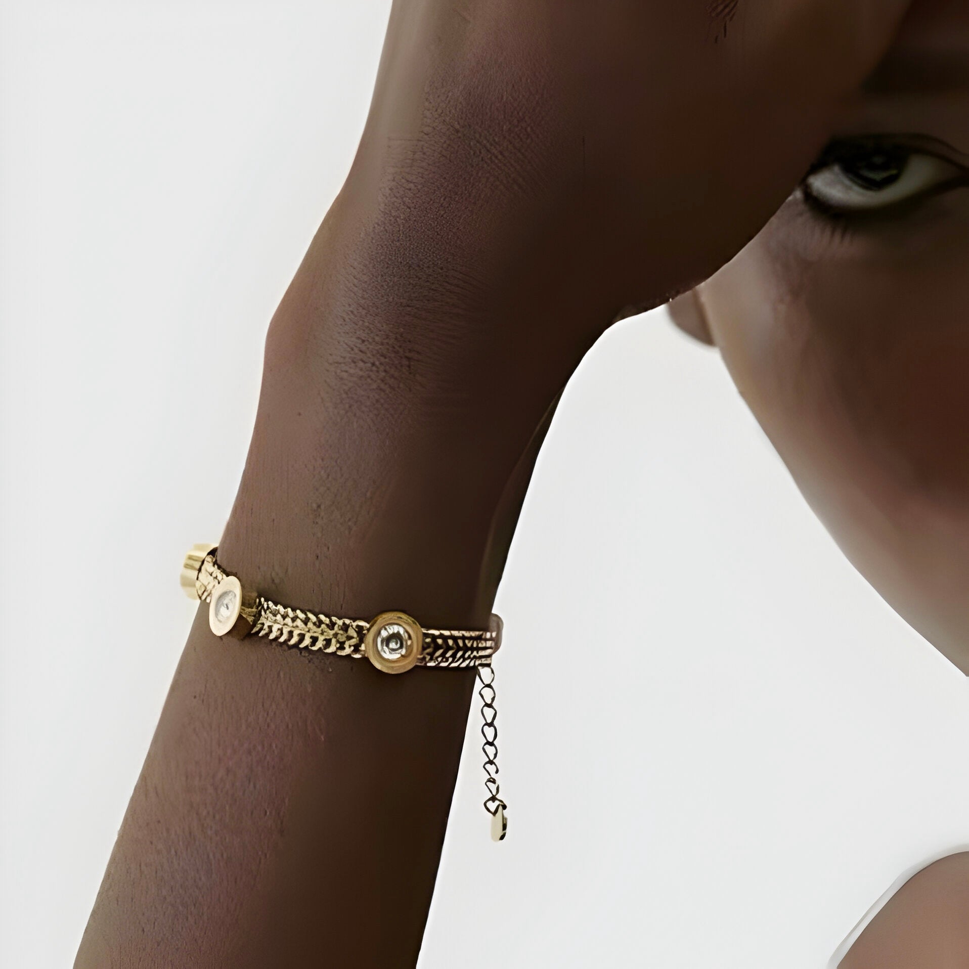 Immergiti nel lusso discreto con il bracciale Augusta, un gioiello che incarna eleganza e raffinatezza senza tempo. Realizzato in pregiato acciaio inossidabile, questo bracciale è impreziosito da una placcatura PVD in Oro 18k, che gli conferisce una lucentezza e una durabilità eccezionali.