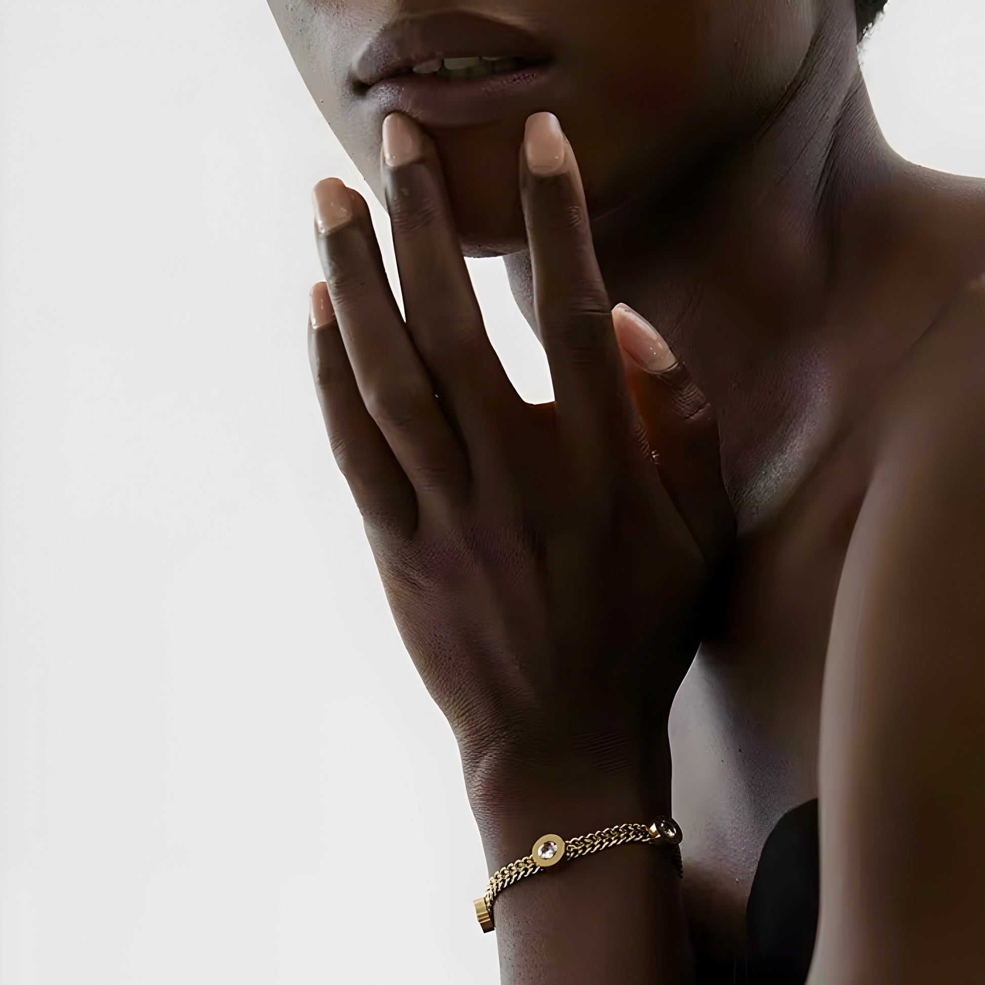 La maglia intricata del bracciale Augusta si avvolge elegantemente attorno al polso, offrendo un comfort eccezionale e una vestibilità perfetta. Il dettaglio delle pietre preziose, posizionate strategicamente lungo il bracciale, crea un gioco di luci e ombre che esalta ogni movimento.